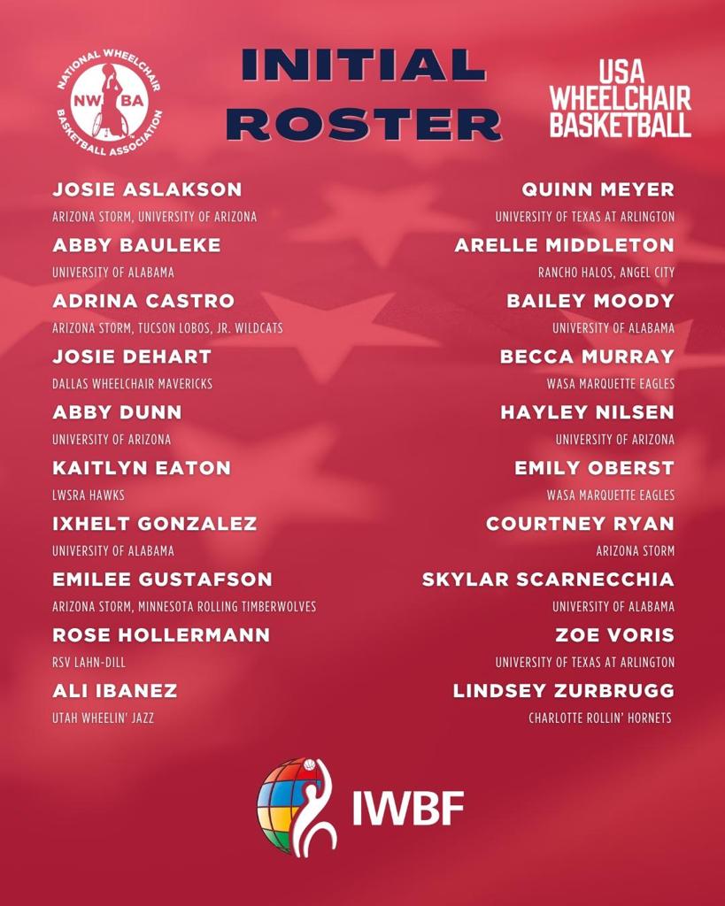 Emilee Gustafson (Big Lake, Minnesota), Hayley Nilsen (Edina, Minnesota), and Abby Dunn (Susanville, California) each earned a spot on the initial roster. Gustafson and Nilsen were both apart of the U.S. Women's National Team that won gold at the 2025 IWBF Americas Cup. In addition, all three were part of Team USA’s gold medal-winning squad at the 2023 IWBF Women’s U25 World Championship.